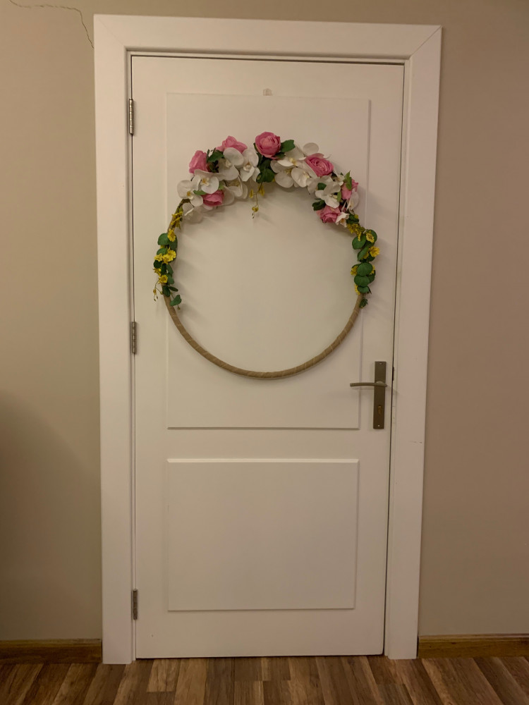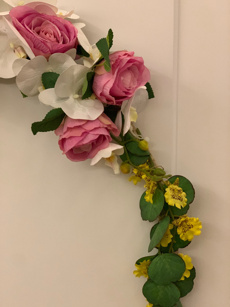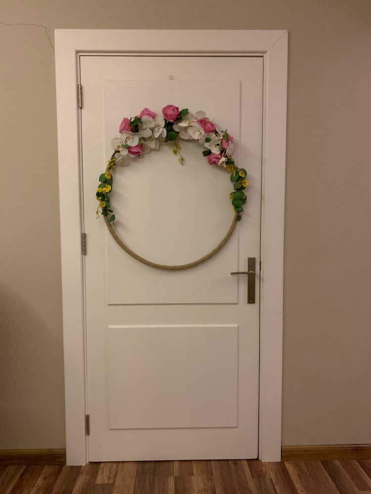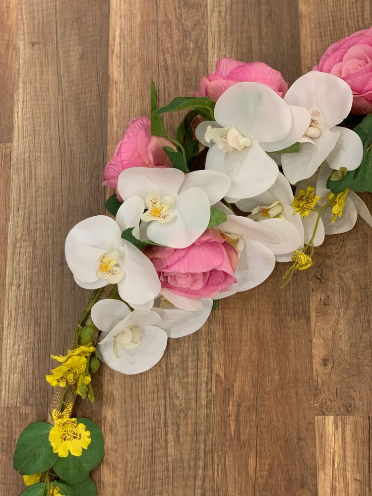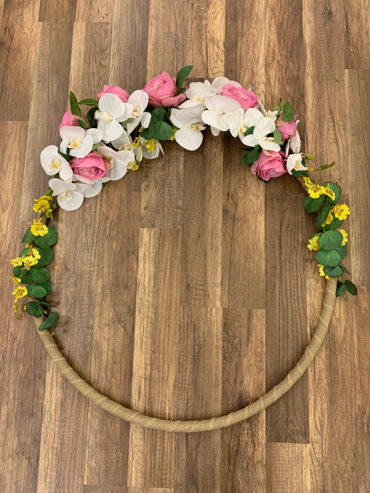 هيلا هوب مغطى بشريط من الخيش مزيّن بزهور وردية واوركيد ابيض وازهار صفراء