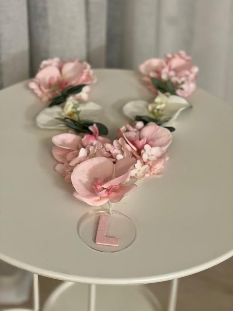 - دائرة ثانية مزينة بحرف “L” بلون وردي مزخرف بنقوش ناعمة، يمكن تخصيص الحرف حسب الطلب