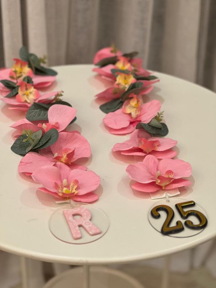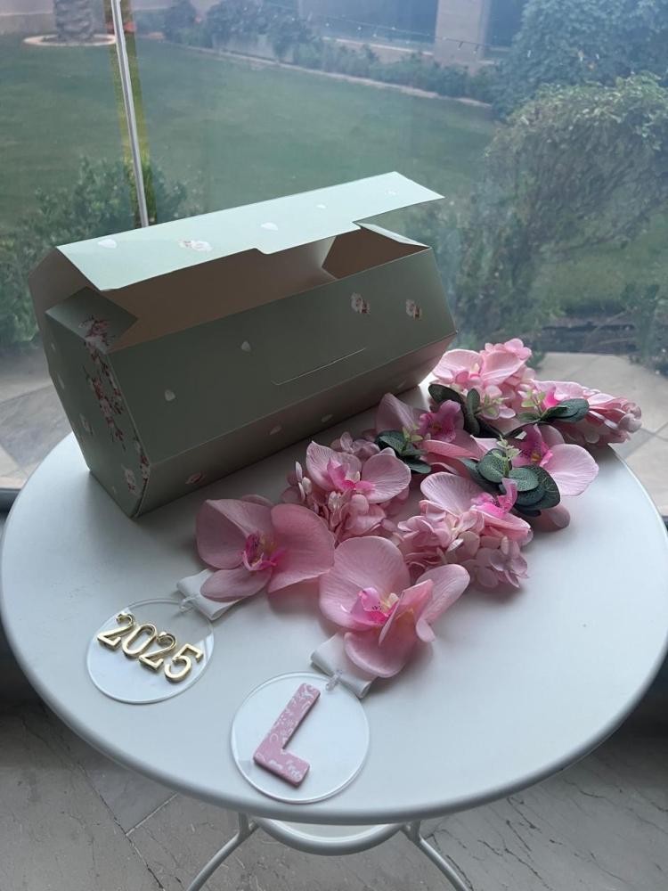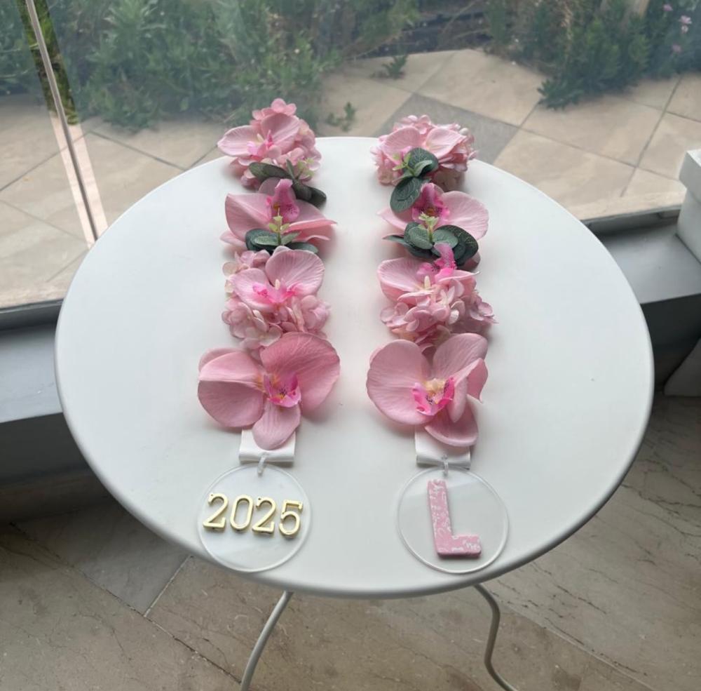 قلادة تخرج أنيقة مصممة يدويًا بتنسيق ناعم من ورود الأوركيد والزهور الوردية الصناعية الفاخرة واللون حسب الطلب ، مع تعليقتين مميزتين: دائرة اكريلك شفافة تحمل سنة التخرج “2025” بحروف ذهبية بارزة.