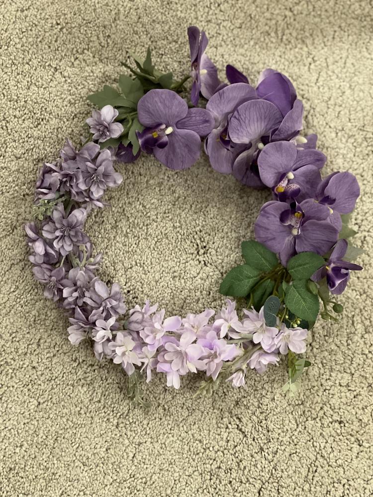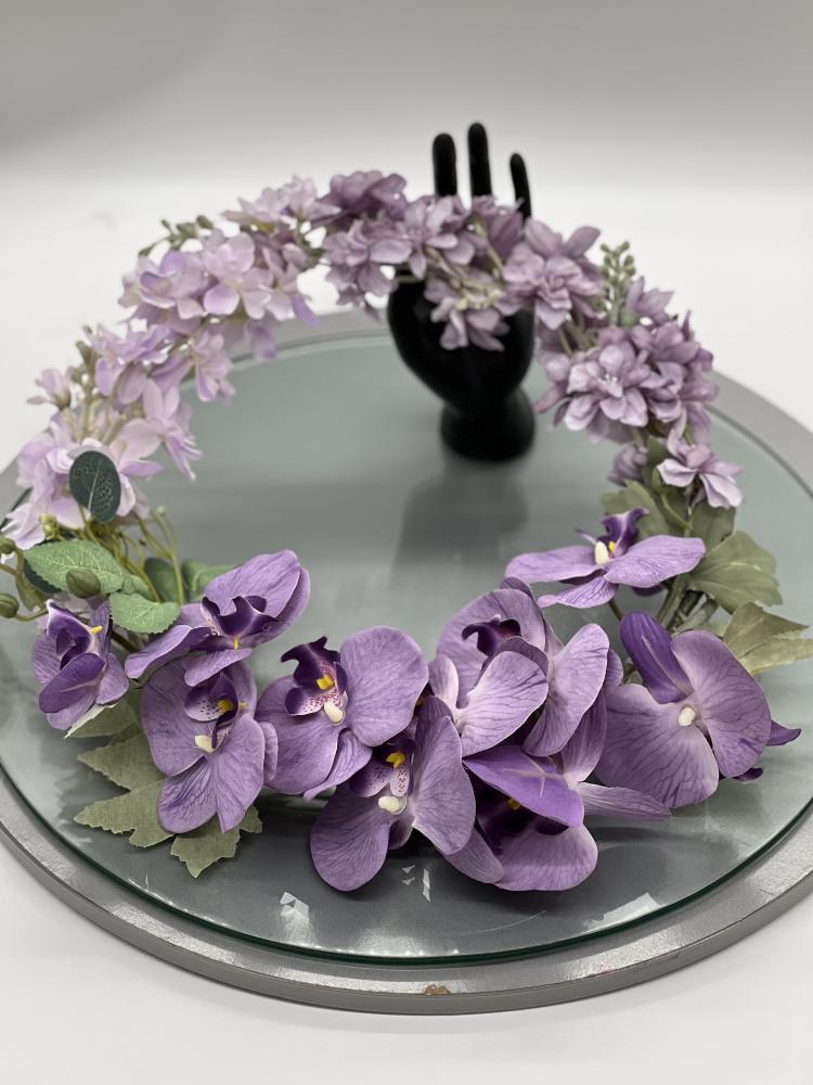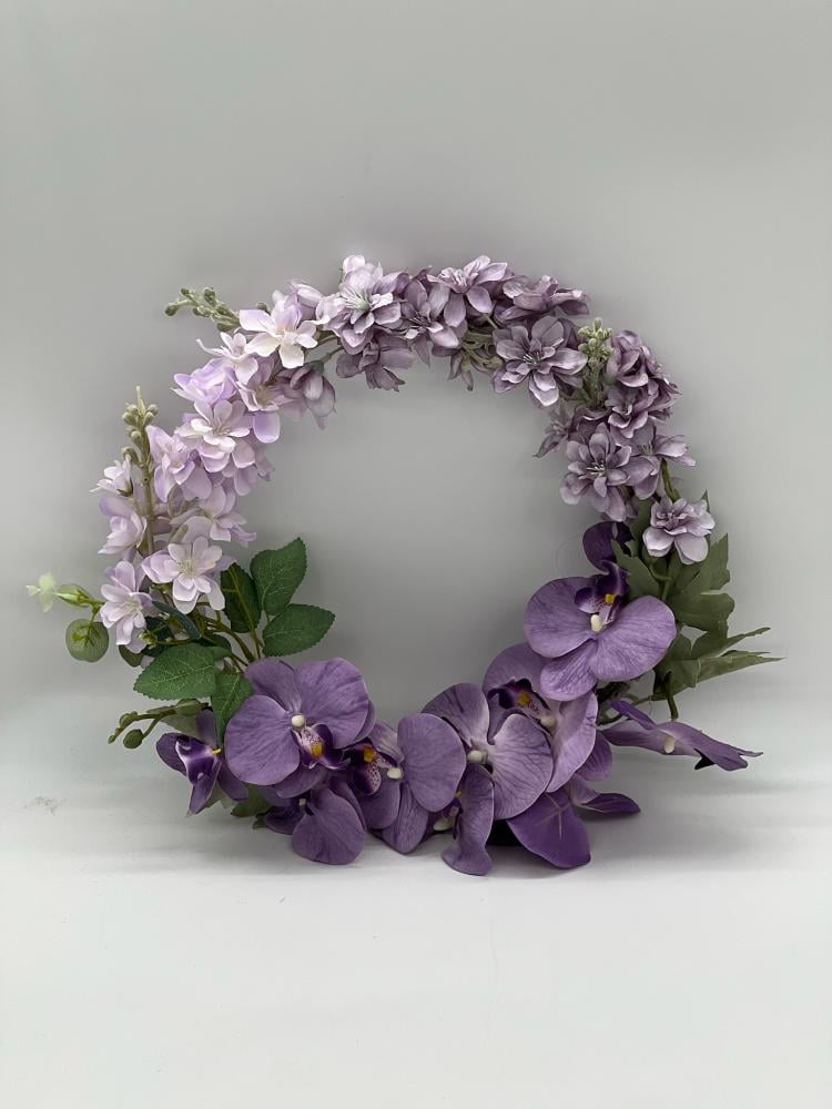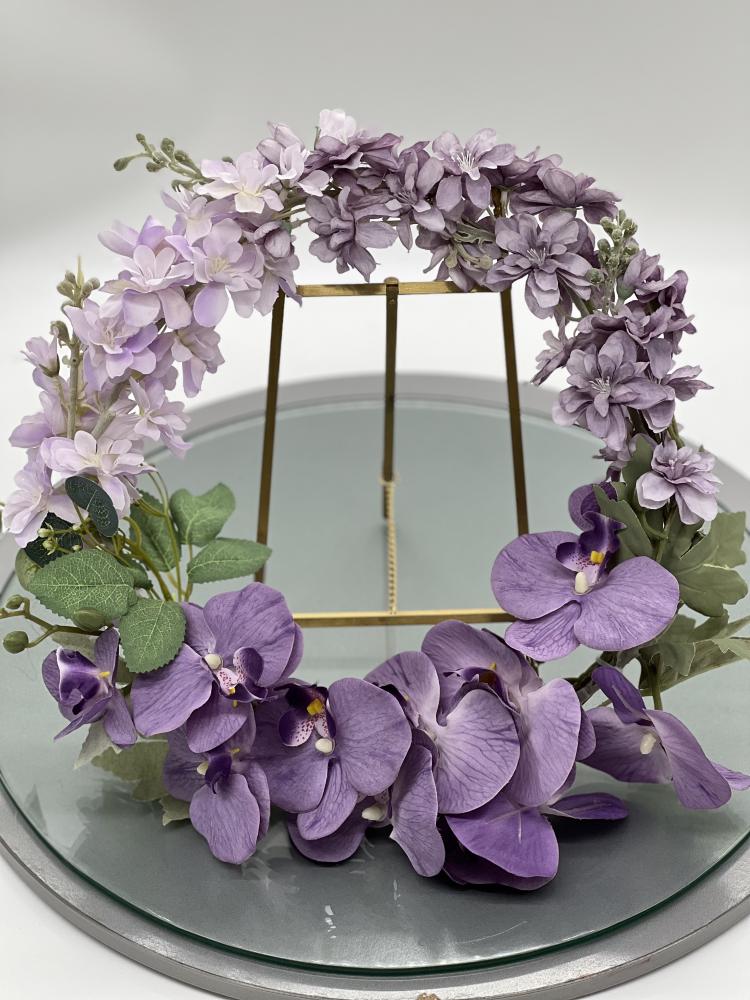 اكليل الروطان بني اللون مزيين بأزهار الجهنمية الفوشي